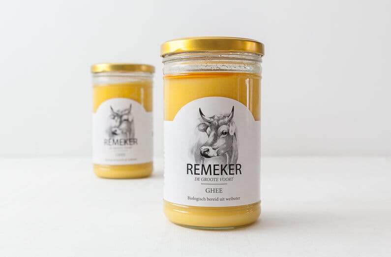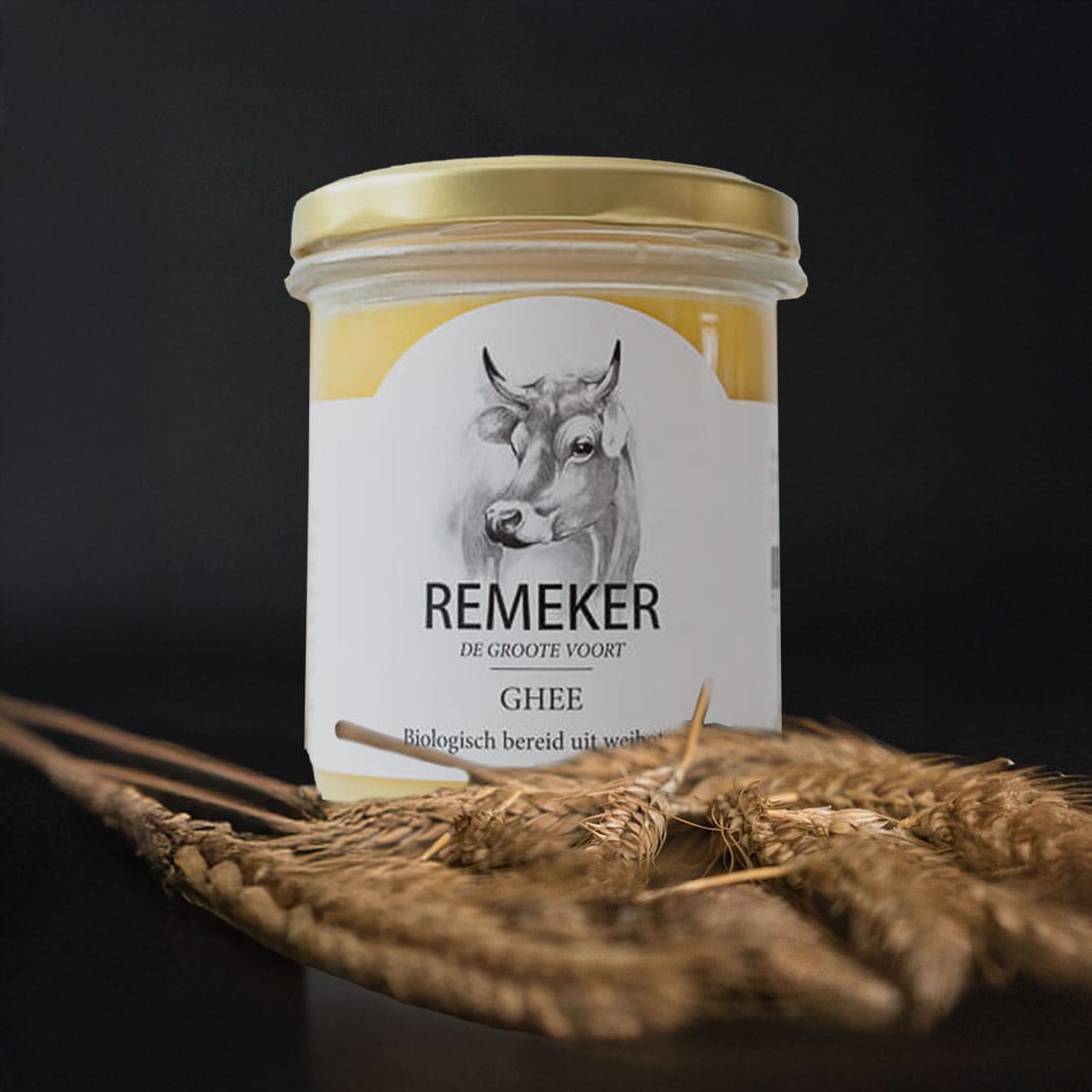Onze ghee (spreek uit als in de naam ‘Guy’ of ‘Guido’) wordt op boerderij ‘De Groote Voort’ bereid uit de weiboter van de melk van onze prachtige Jersey koeien.